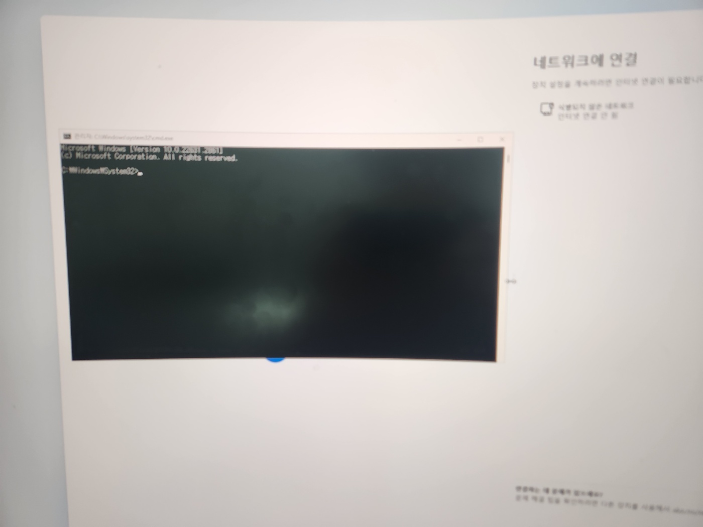 위 화면에서 shift + F10 을 누르면 아래와 같이 검은 명령 프롬프트 화면이 나타납니다.