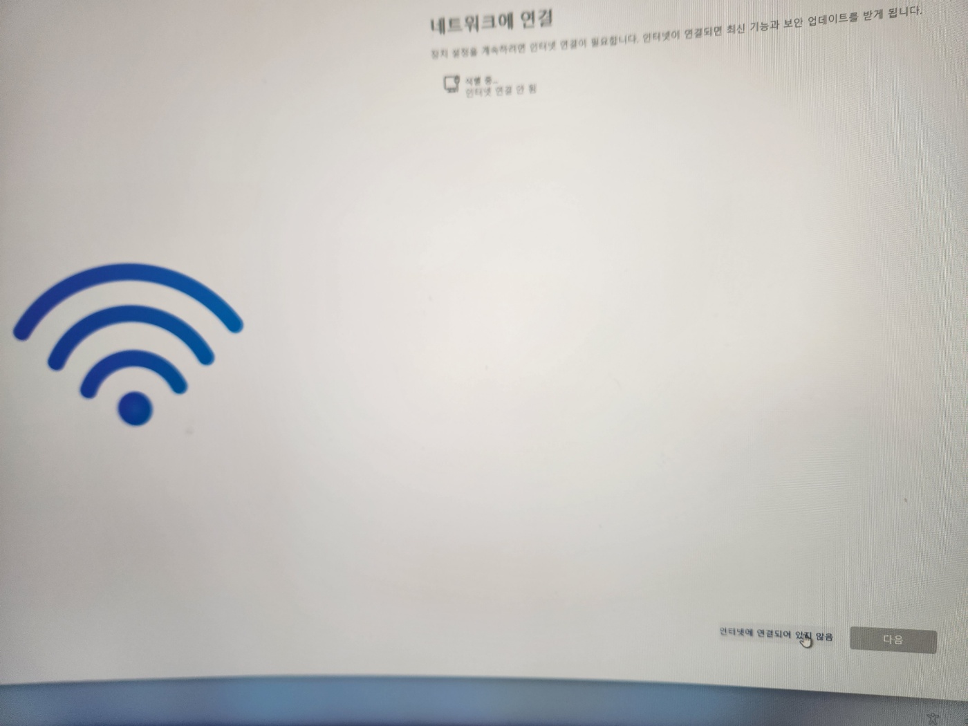 그럼 재부팅이 되고 설치화면이 다시 나타나며, 네트워크 연결화면에서 아래와 같이 "인터넷에 연결되어 있지 않음" 이 나타나고 클릭후 다음 설치 화면으로 넘어간다.