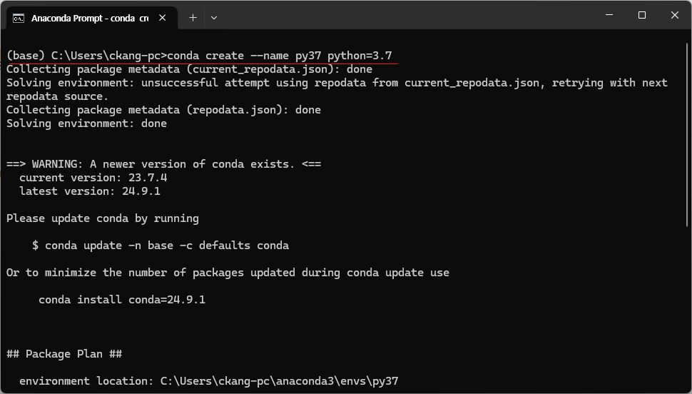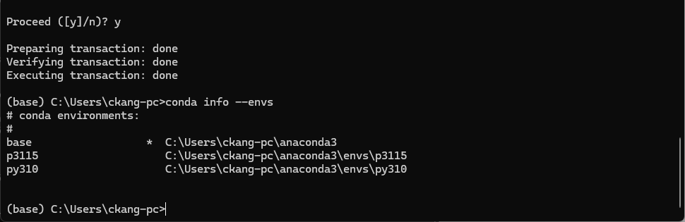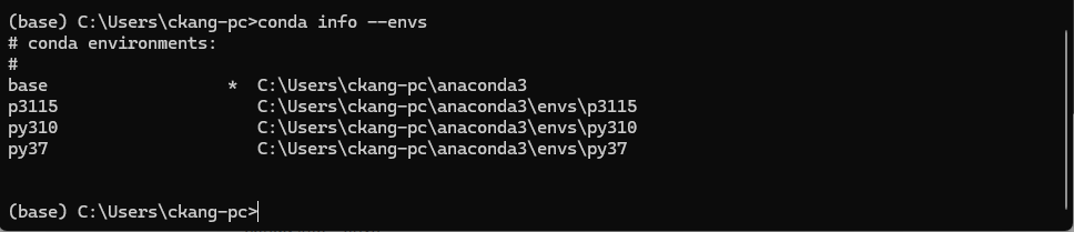 완료 후 환경 리스트 명령어로 다시 확인하면 환경(py37)이 삭제된 것을 확인할 수 있다.