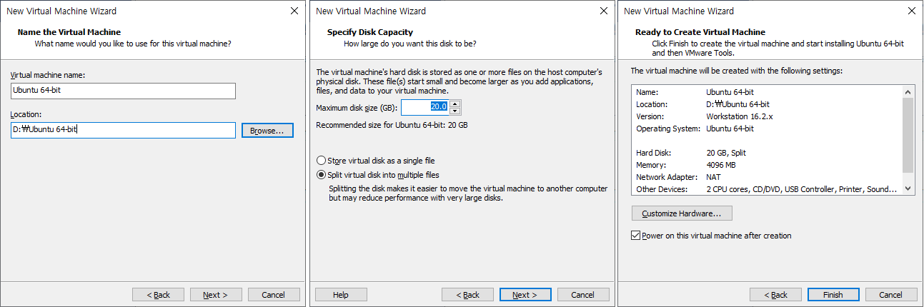 13. 설치될 가상머신(=우분투)의 경로, 할당될 하드디스크 용량 등을 설정하고 최종 하드웨어 스펙을 확인한다.