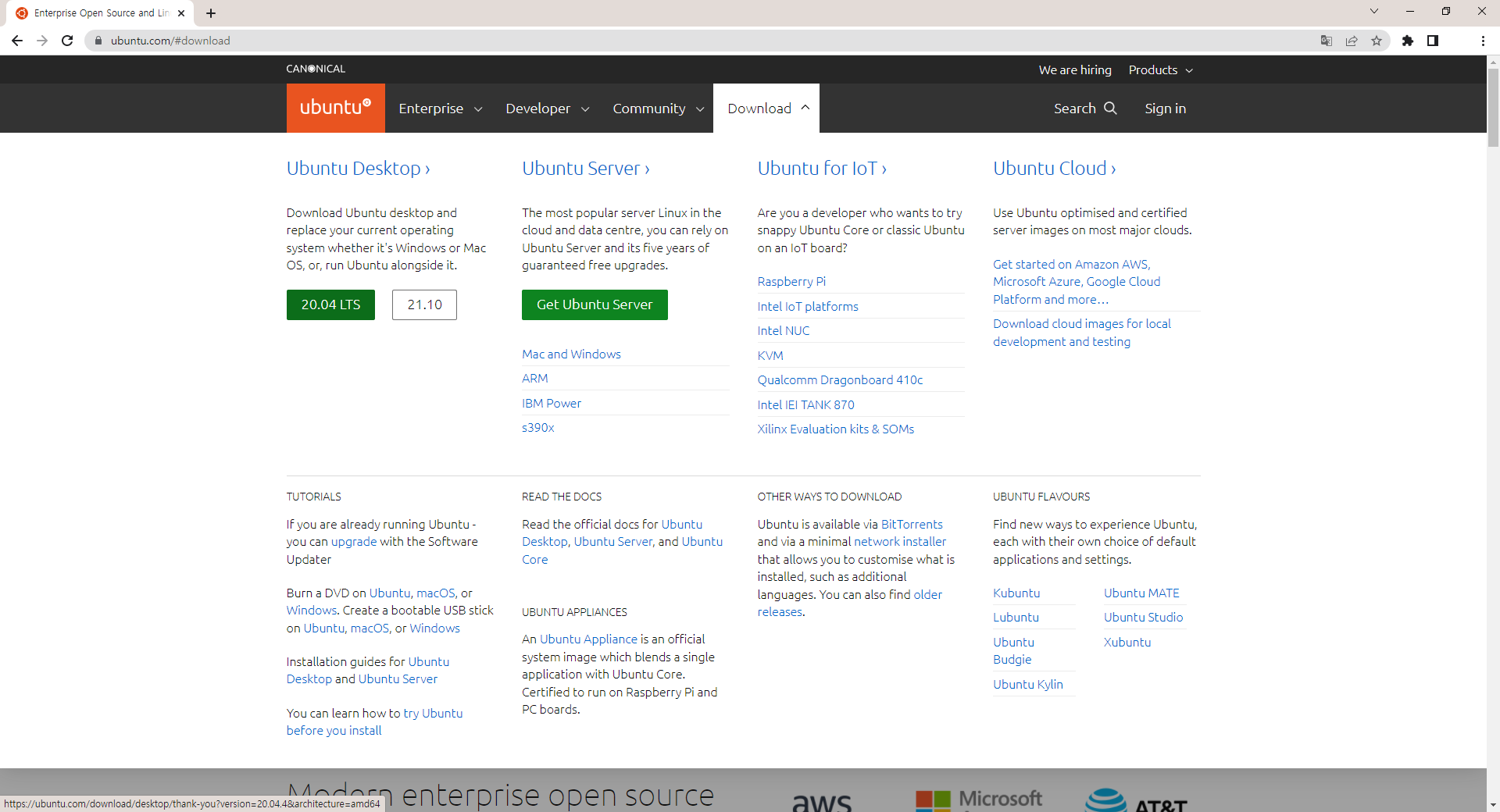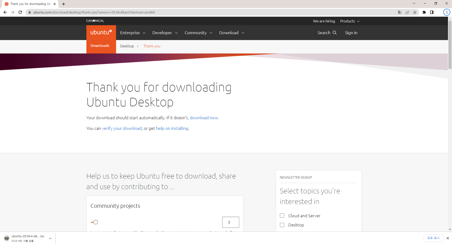 7. 아래 화면에서 잠시후 파일 다운로드 시작됨(파일: ubuntu-20.04.4-desktop-amd64.iso)