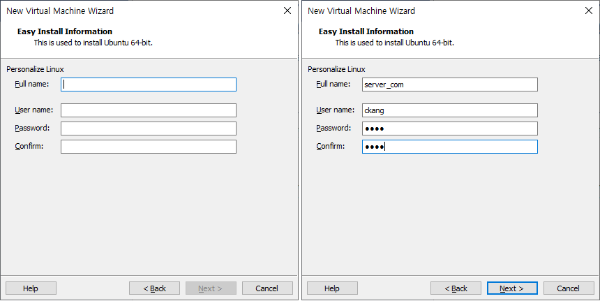 12. 설치될 우분투(Full name)의 이름과 사용자 계정 이름(User name), 비밀번호(Password)를 각각 입력한다.