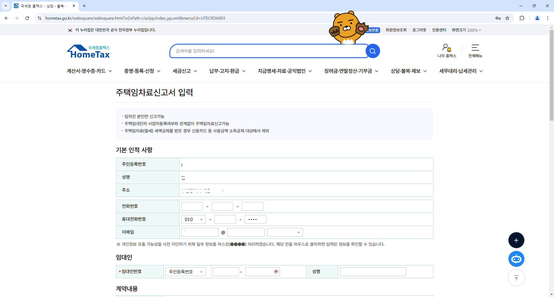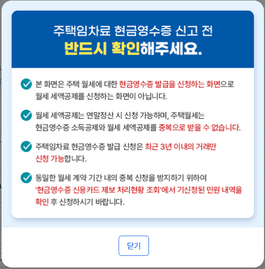 주택임차료(월세) 현금영수증 발급 신청 메뉴를 클릭하면 아래와 같이 창이 나타난다.