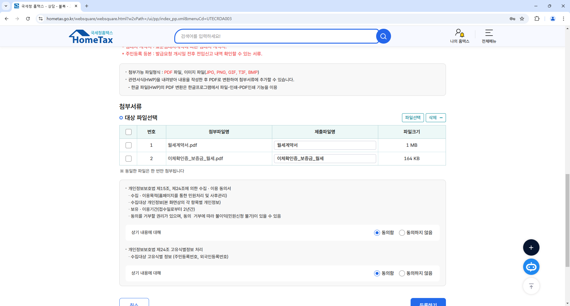 모든 사항을 입력하면 아래 창과 같이 첨부서류 업로드 할 수 있는 곳이 있는데 이때 임대차계약서와 월세입급내역서(보증금 포함시 보증금입금이 포함된 내역서)를 문서파일, 또는 이미지 파일로 업로드 한다.
