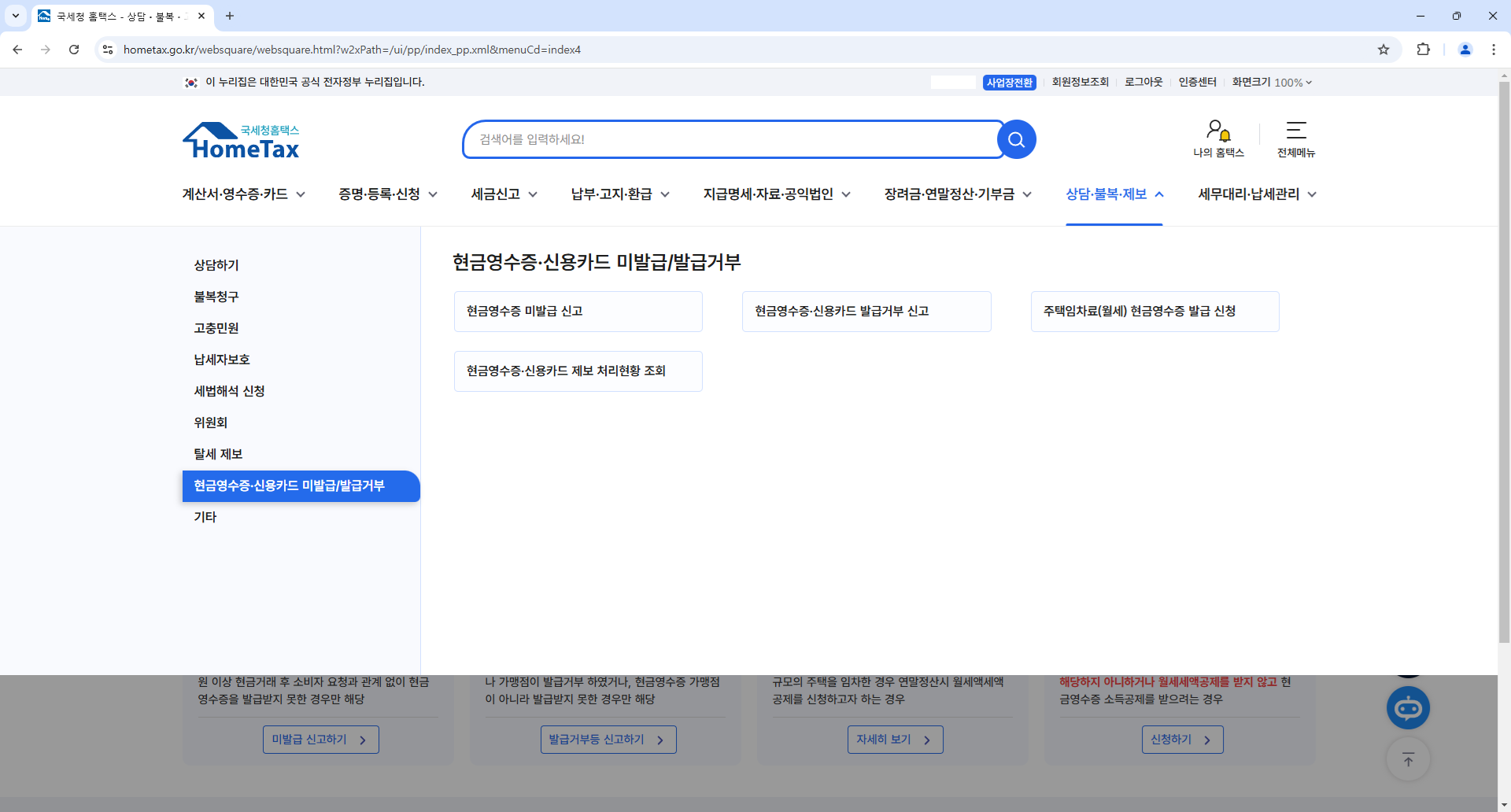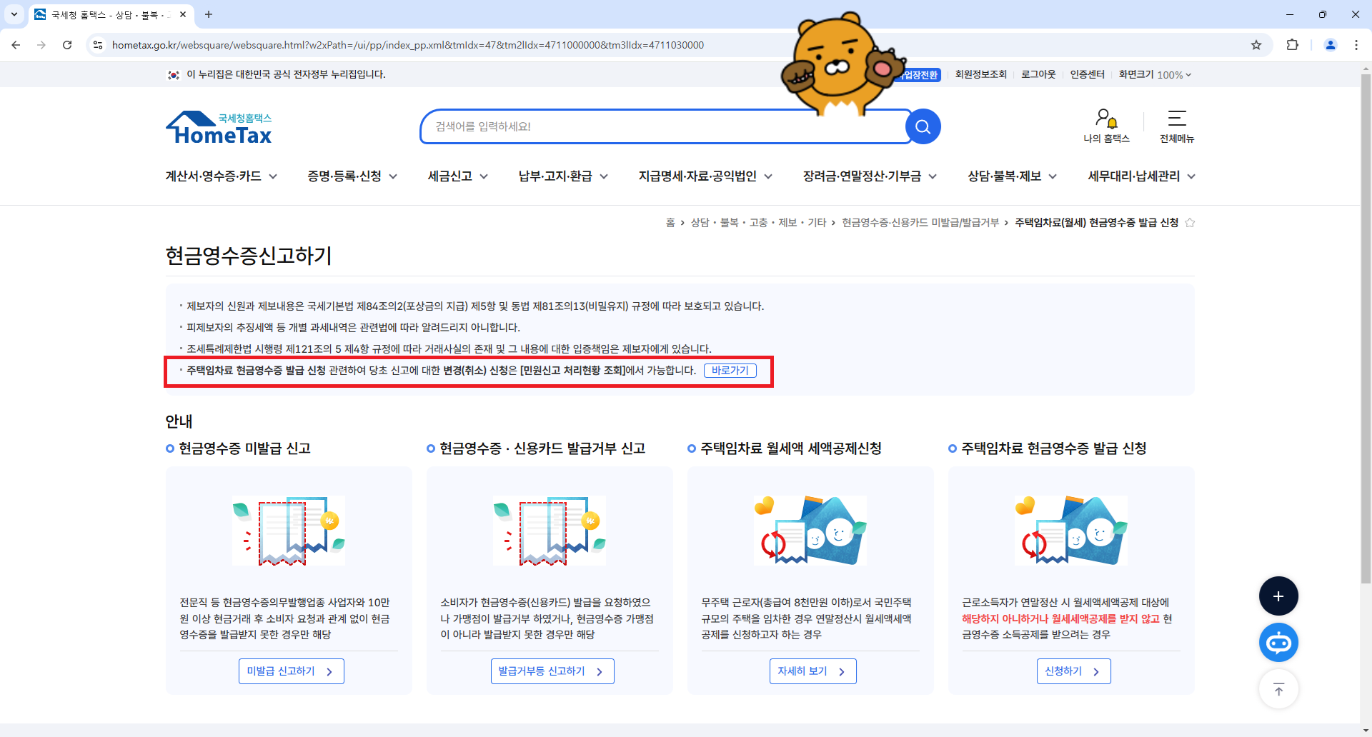 상담.불복.제보 -> 현금영수증.신용카드 미발급/발급거부 -> 주택임차료(월세)현금영수증 발급 신청