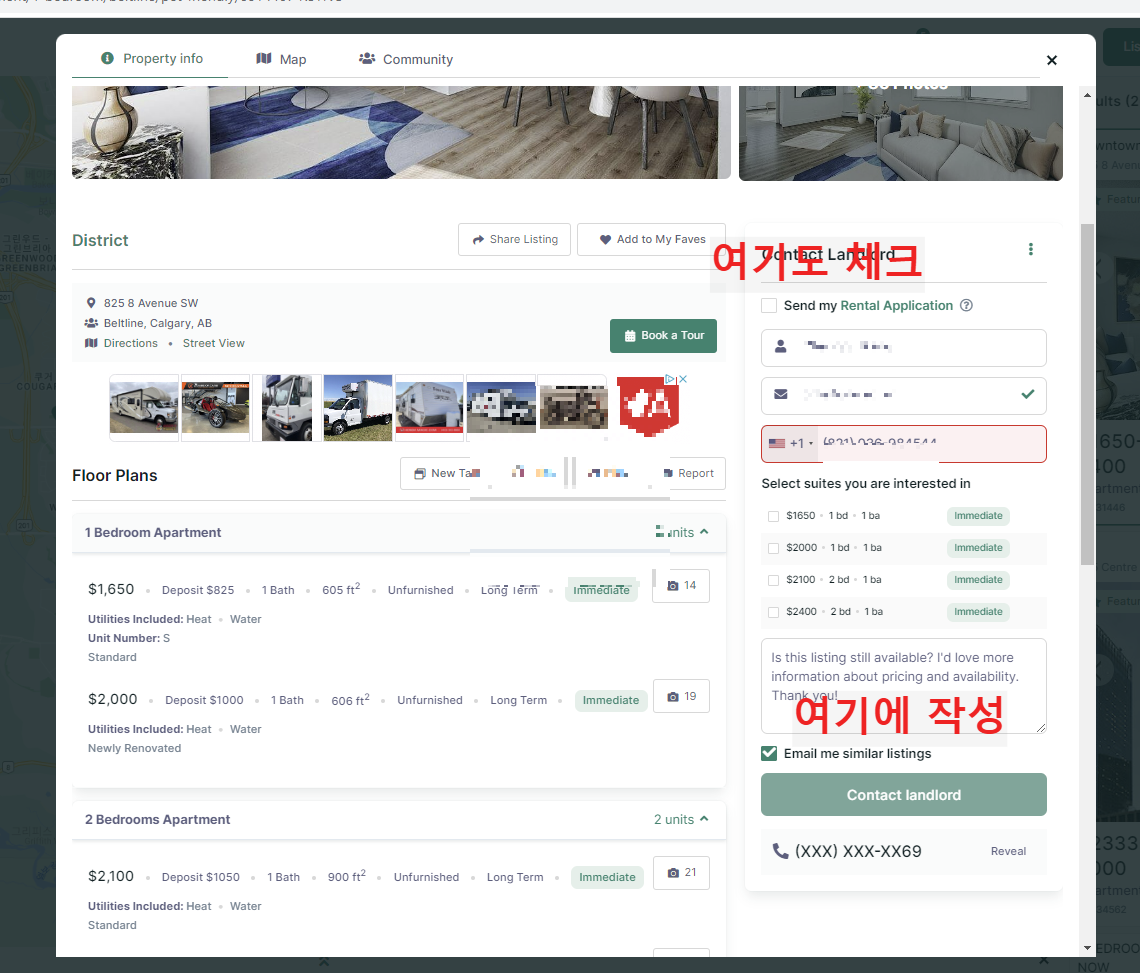 (이때 send my rental application 을 체크하기 바랍니다.)