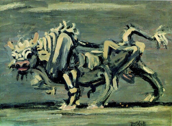 이중섭의 부산 범일동 시기의 대표작 중 일부는 그가 겪은 내면의 고통과 그리움을 표현하는 작품들로, 특히 소를 중심으로 한 동물들이 주된 모티프가 됩니다. 그는 부산에서의 고통스러운 현실을 자신의 작품에 투영하며, 소와 동물들을 통해 내면의 갈등을 그려냈습니다. 그의 작품에서 나타나는 소는 단순한 동물이 아니라, 그가 겪은 전쟁의 고통, 상실감, 그리고 그리움을 상징하는 중요한 요소로 다가옵니다.