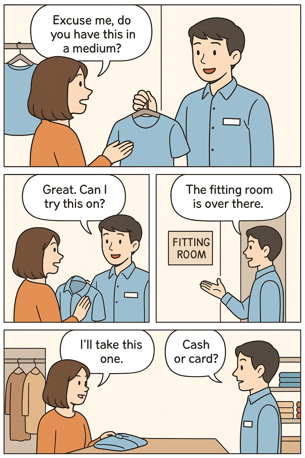 쇼핑할 때 자주 쓰는 영어 표현 – 만화 예제