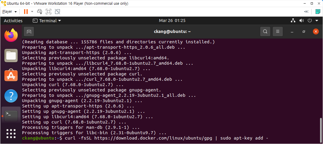 - 명령어: sudo apt-get install apt-transport-https ca-certificates curl gnupg-agent software-properties-common