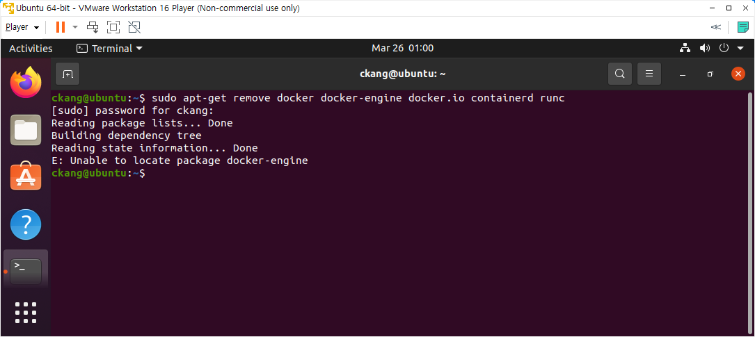 - 명령어: sudo apt-get remove docker-engine docker.io containerd runc
