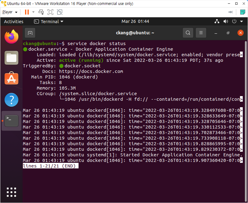 - Docker 가 active 되어 동작하고 있는 것을 확인할 수 있다.