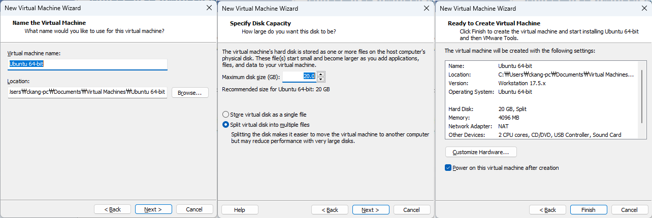 12. 설치될 가상머신(=우분투)의 경로, 할당될 하드디스크 용량 등을 설정하고 최종 하드웨어 스펙을 확인한다.