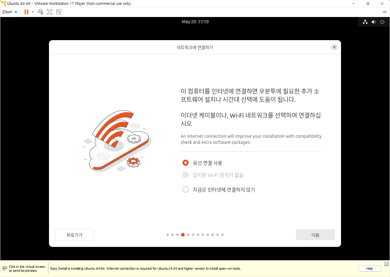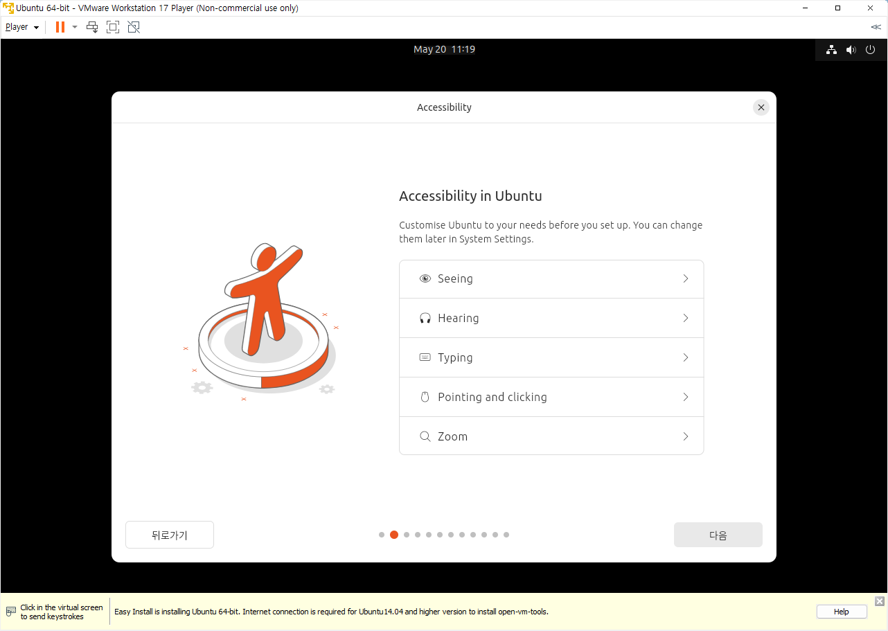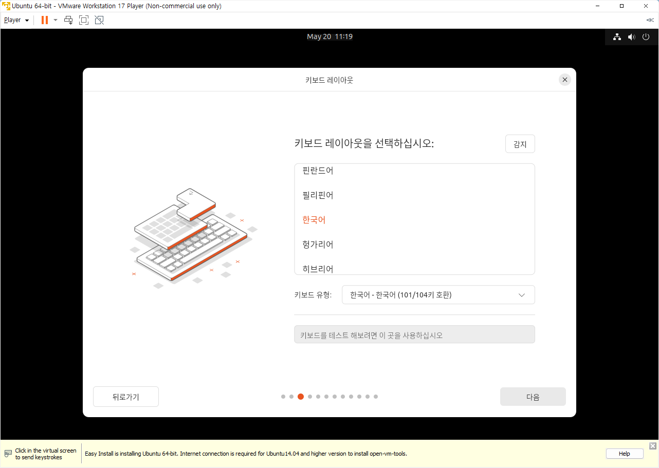 14. 언어 선택(한국어) -> Accessibility in Ubuntu 설정 -> 키보드레이아웃 선택 -> 네트워크 연결이 나타난다.