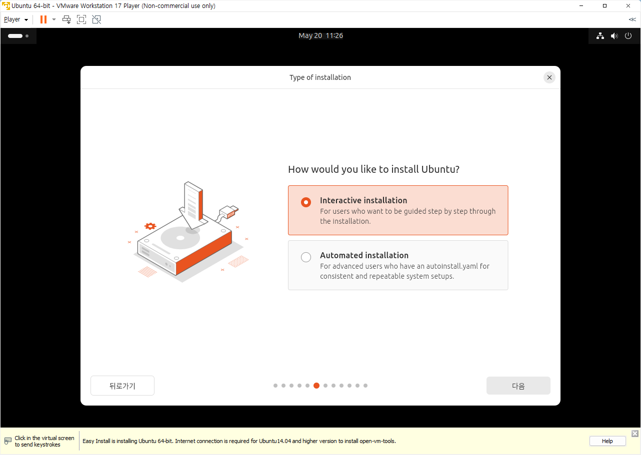 16. 다음 화면은 우분투는 대화형 설치(Interactive Installation)와 자동화 설치(Automated Insatallation) 방식을 묻는 화면이다. 난 대화형 선택 후 다음 클