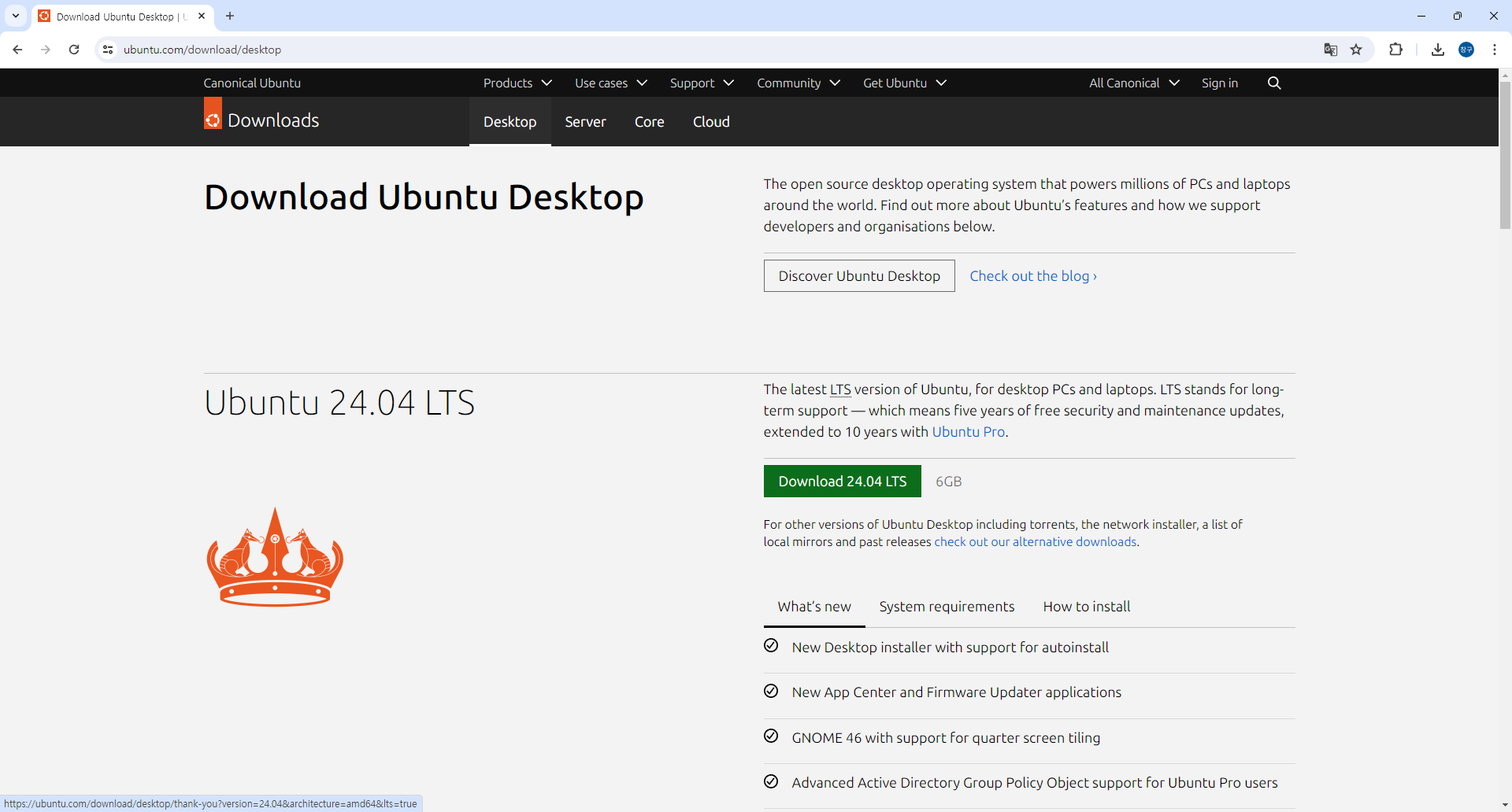 8. Download 24.04 LTS 클릭 다운로드(ubuntu-24.04-desktop-amd64.iso 5.69GB)