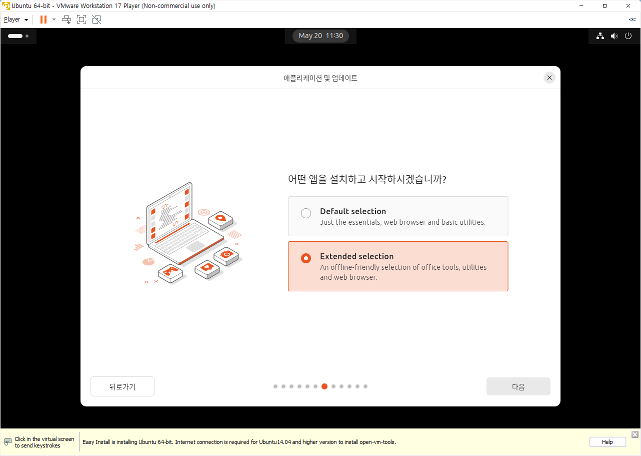 17. 다음은 기본 설치(Default selection)를 할것인가? 확장설치(Extended selection)을 할 것인가? 묻는다. 차이는 기본설치는 정말 기본 패키지만 설치되고 확장설치는 필요한 Utility가 함께 설치된다. 그래서 난 확장설치 선택 ^^