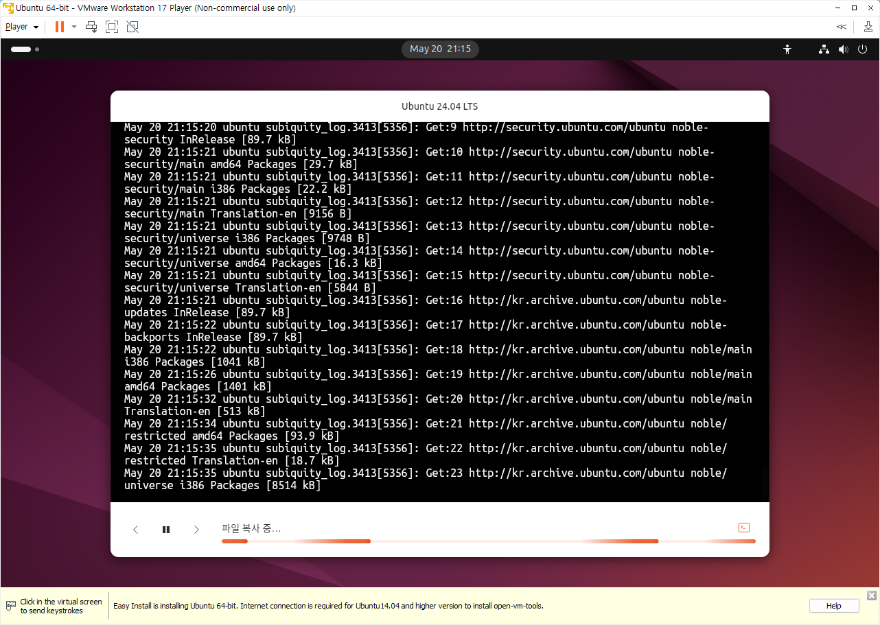 13. Finish를 누르면 아래와 같이 Ubuntu 설치 시작한다.