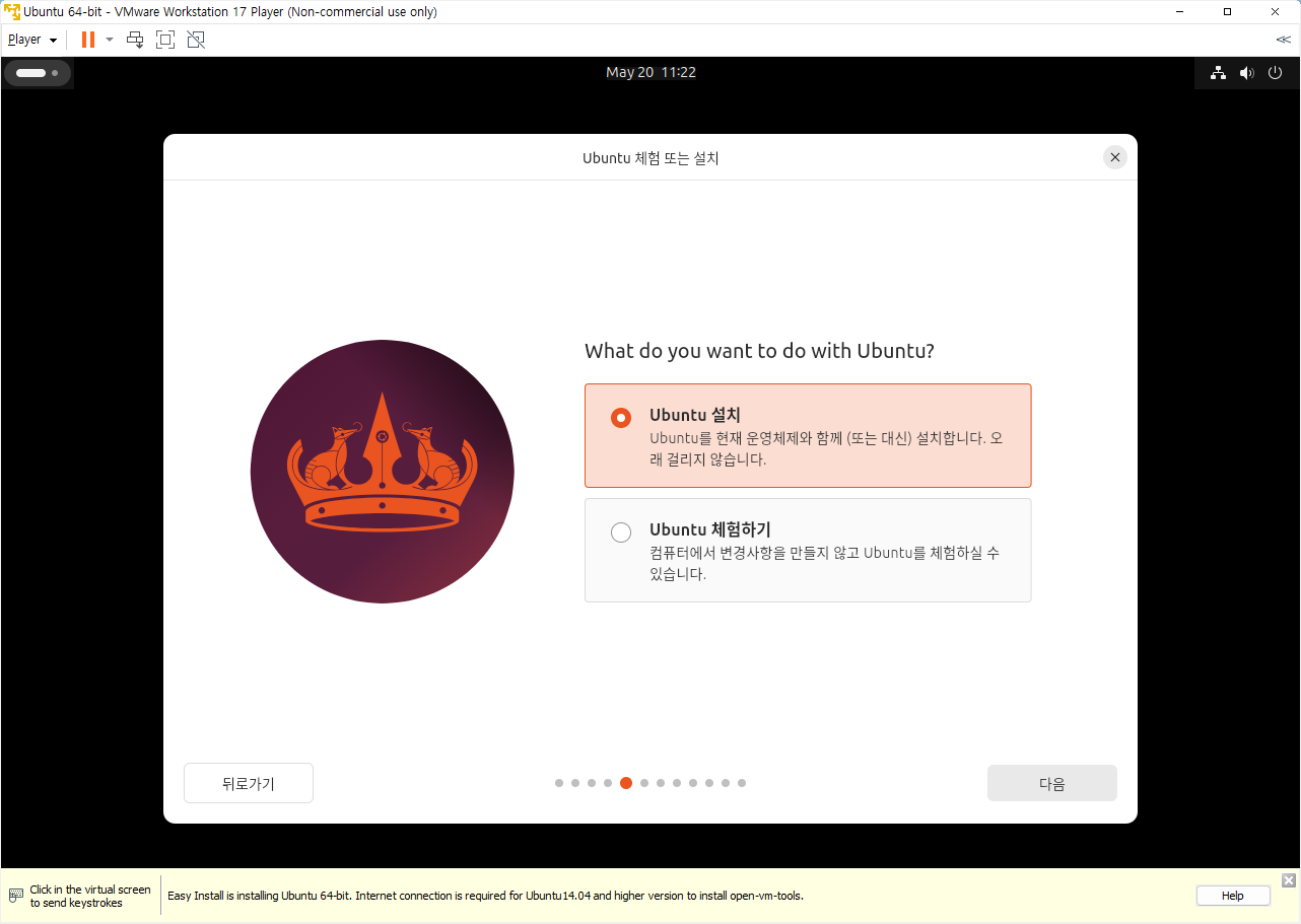 우분투를 시스템에 설치할 것인가? 우분투 체험을 할 것인가? 묻는 화면이다. 그냥 설치하자. ㅎㅎ