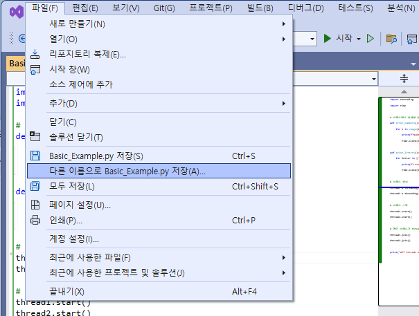 아래와 같이 Visual Studio 창의 메뉴바에서 파일 메뉴 선택