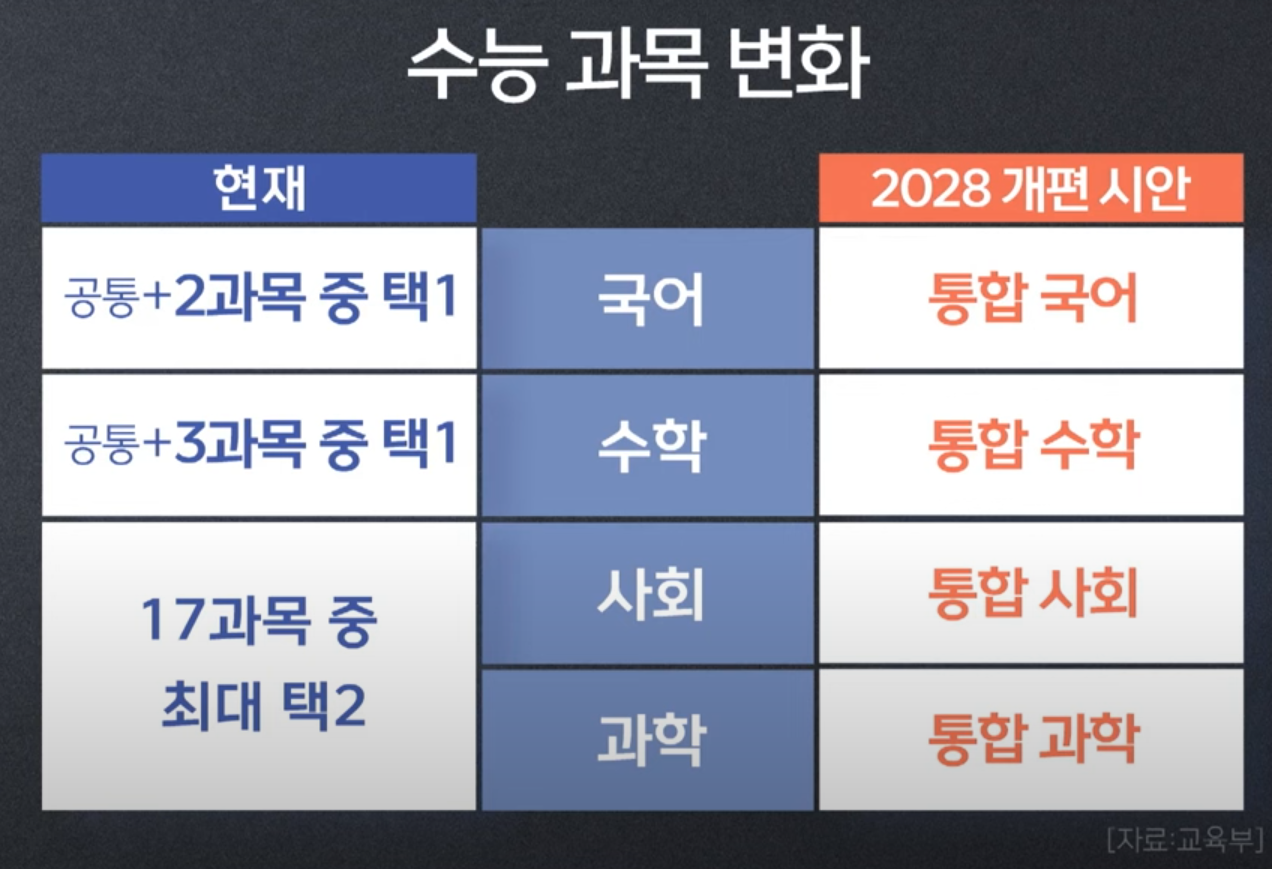 모든 수험생은 선택 과목 없이 통합 국어, 수학, 사회, 과목으로 시험(입시 유리한 과목 선택에 대한 부작용을 제거함)